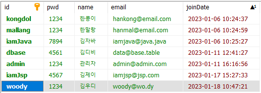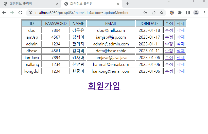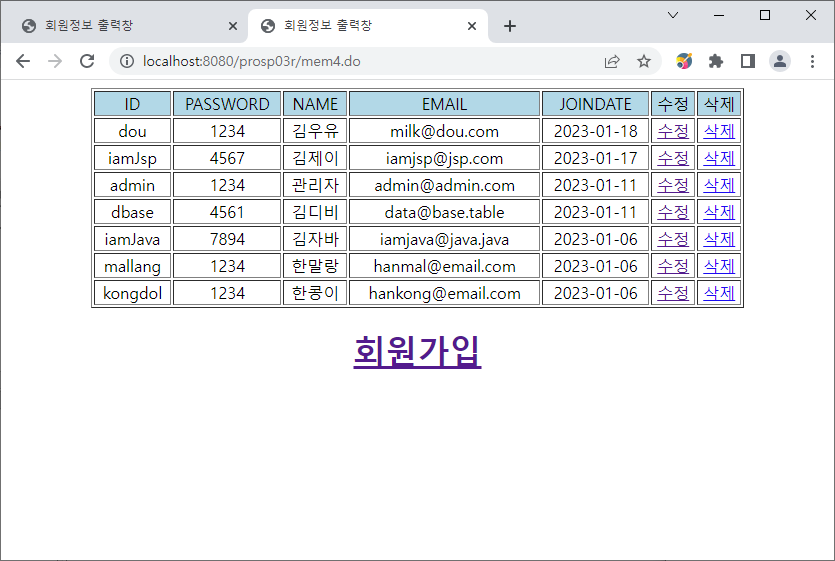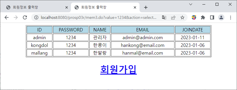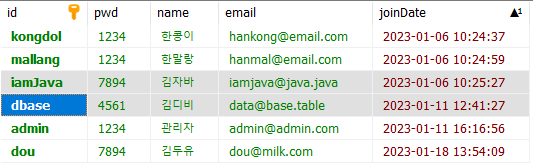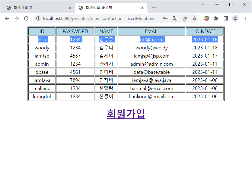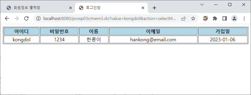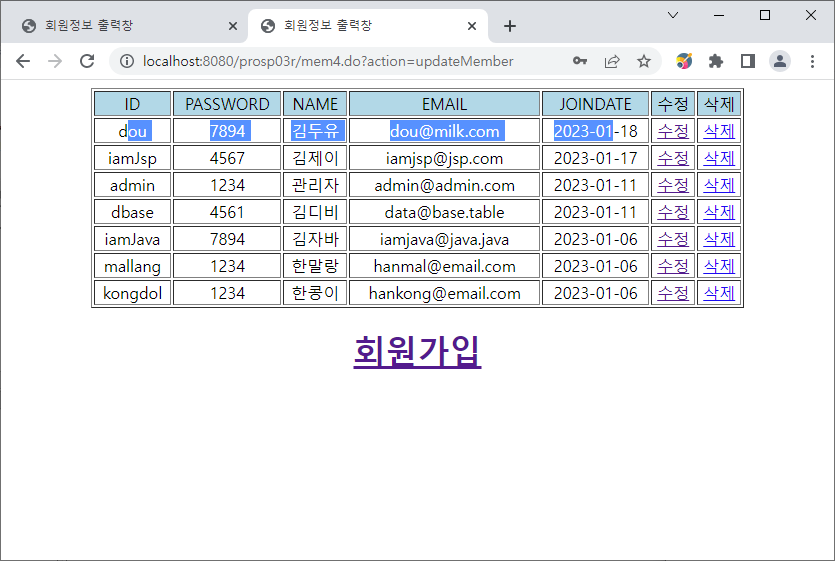 데이터베이스에 존재하는 두 회원의 정보가 나온다.