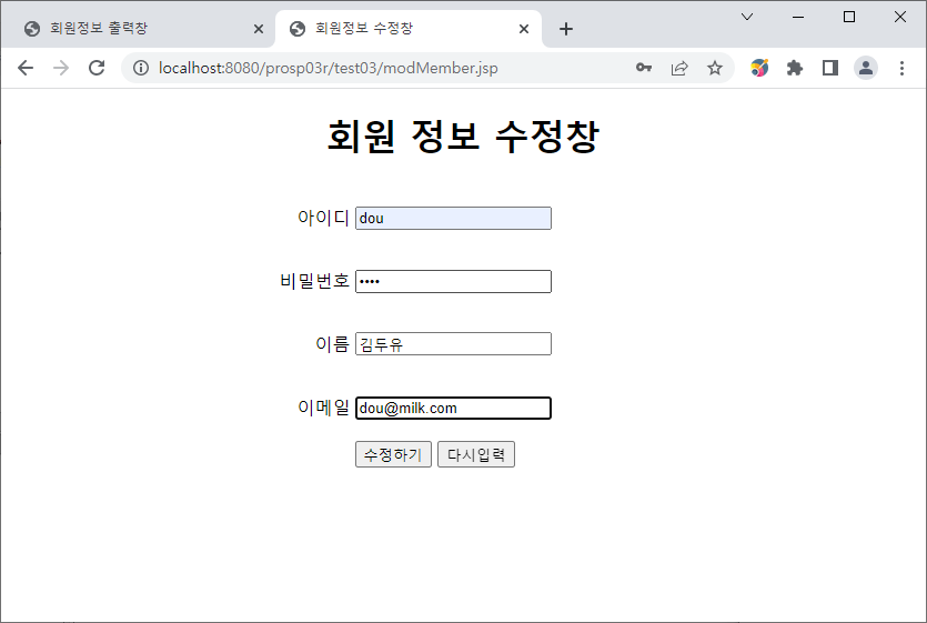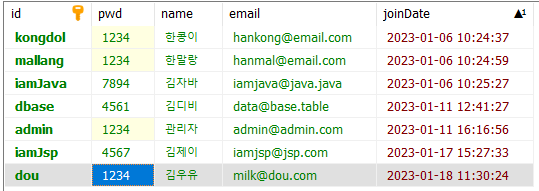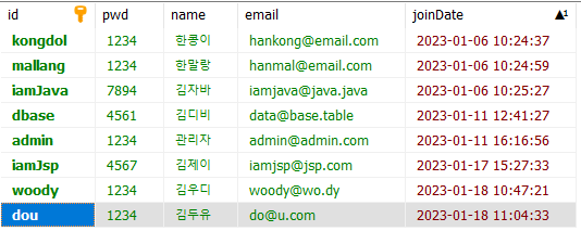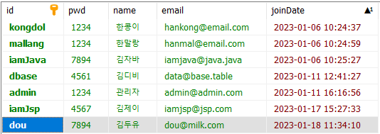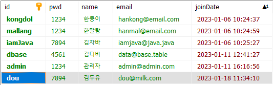 id가 dou인 회원의 비밀번호, 이름, 이메일을 수정하기 위해 해당칸에 다른 데이터를 입력.