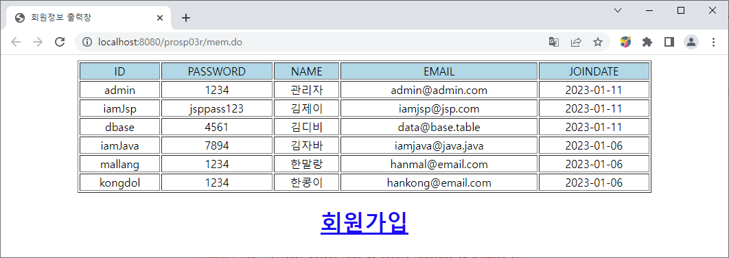 memList.add(new MemberVO("m2", "1234", "정길동", "m2@test.com"));
