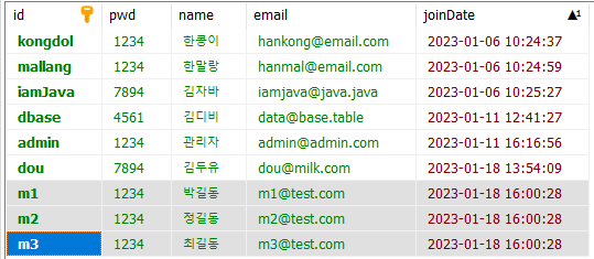 memList.add(new MemberVO("m1", "1234", "박길동", "m1@test.com"));