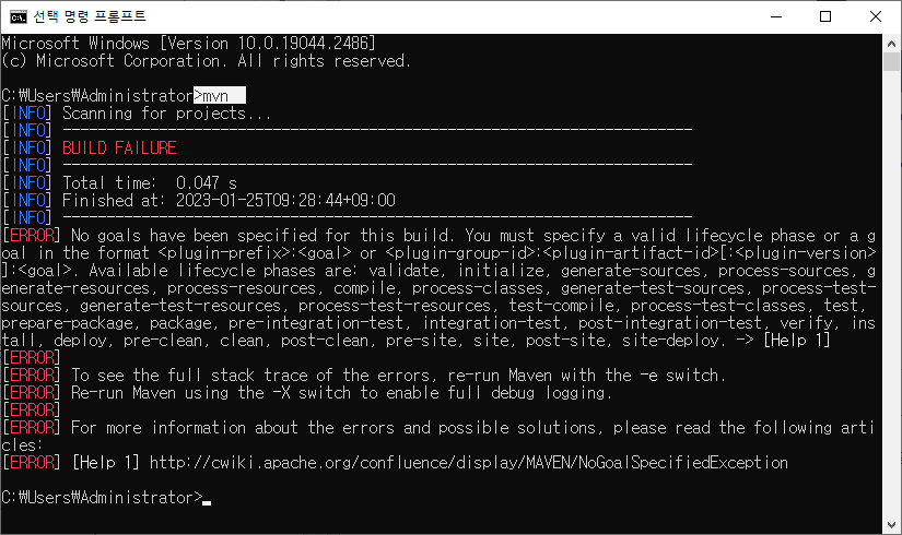 cmd창에서 mvn 입력 후 다음 결과가 나오면, 정상적으로 설치된 것이다.