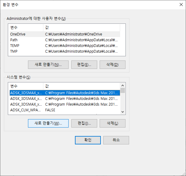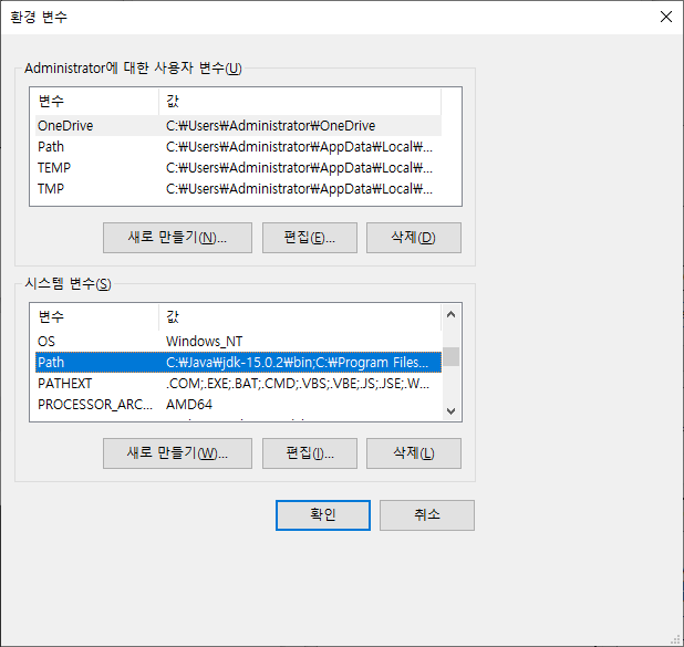 환경변수에서 시스템변수만 path 설정.