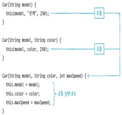 필드 초기화 내용을 한 생성자에만 집중 작성하고 나머지 생성자는 초기화 내용을 가진 생성자로 호출.