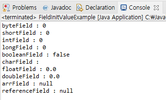 필드의 초기값이 생략되면, 기본 초기값으로 자동 설정된다.