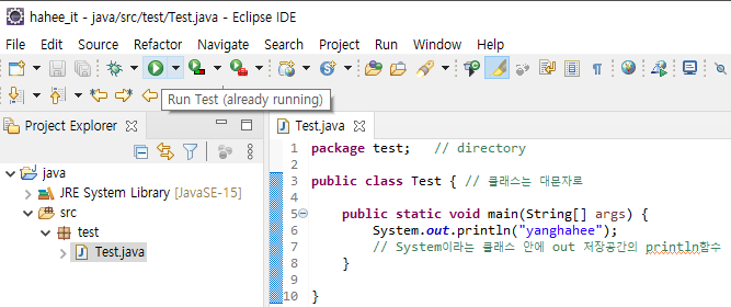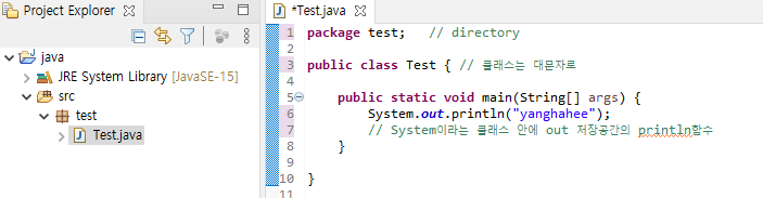 System이라는 클래스 안에 out 저장공간의 println함수를 불러와 실행시킨 것으로 이해하면 되겠다.