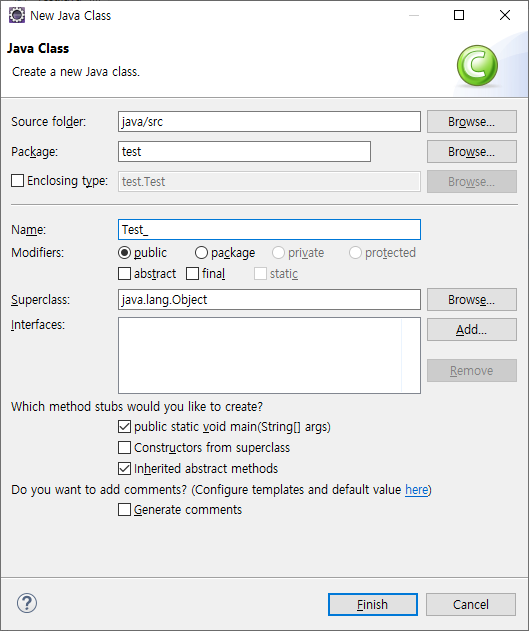 public static void main(String[] args)를 체크하면 자동으로 생성된다.