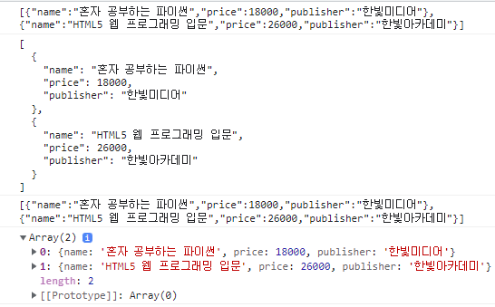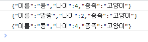 위 코드의 경우, JSON 객체 안에 속성이 3개씩 들어있다고 보면 된다.