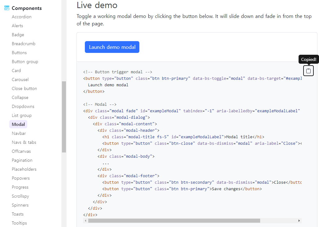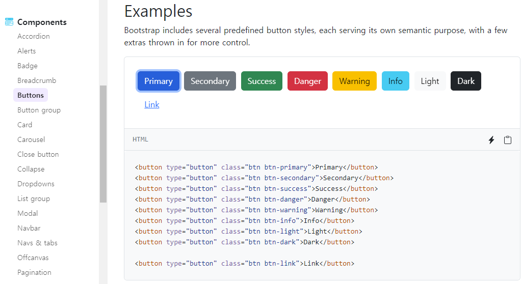 Components - Buttons에서 마음에 드는 항목 선택, 복사-붙여넣기