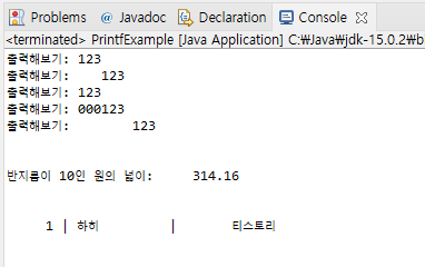System.out.printf("반지름이 %d인 원의 넓이: %10.2f\n", 10, area);