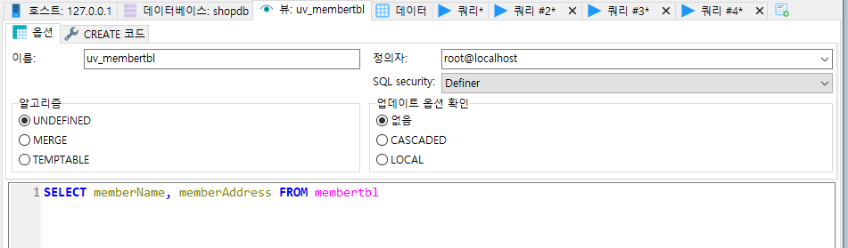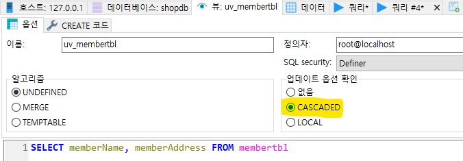 업데이트시 뷰는 같이 되지 않으면 안되니, 업데이트 옵션 확인을 CASCADED로 해주어야 한다.