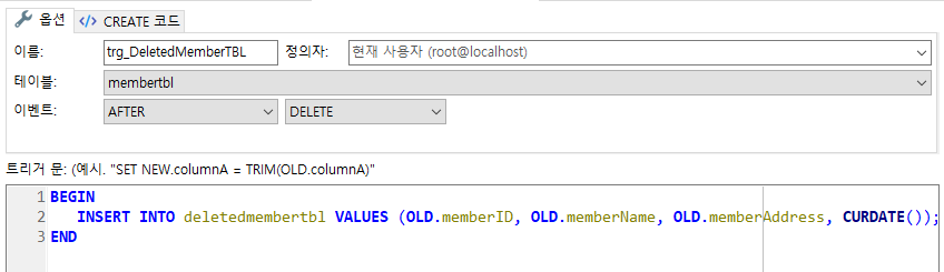 VALUES (OLD.필드명, OLD.필드명, OLD.필드명, CURDATE() ) ; : CURDATE()로 삭제된 시간을 넣고, 삭제되기 전이니까 OLD.필드명으로 삭제되는 것을 백업 (OLD와 NEW 두가지 사용)