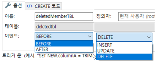 이벤트를 before, after(시점)/ insert, update, delete(행위) 설정할 수 있다.