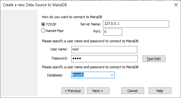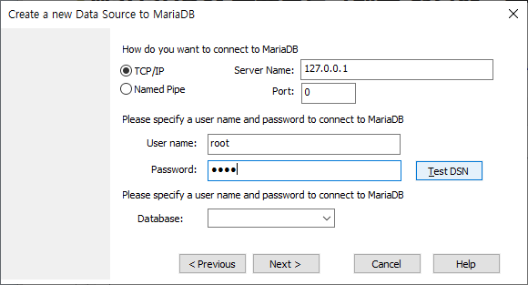 TCP/IP와 User name, password 입력하고 Test DSN버튼 누르기