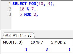 - 매개변수를 숫자1 % 숫자2 또는 숫자1 MOD 숫자2로 표현 가능