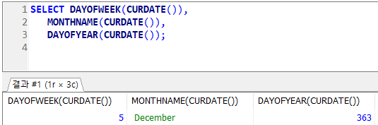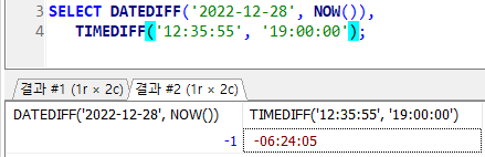 TIMEDIFF(날짜1또는시간1, 날짜1또 는시간2) • DAYOFWEEK(날짜), MONTHNAME(), DAYOFYEAR(날짜)