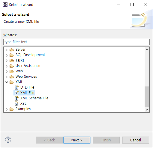 프로젝트의 마우스 오른쪽- new - other - XML - XML File - Next