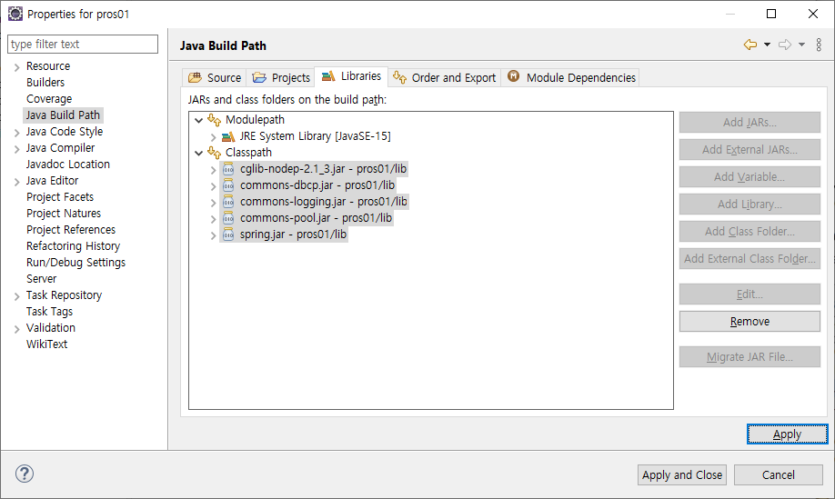 복사한 jar파일들을 Add JARs해서 classpath에 추가해준다.