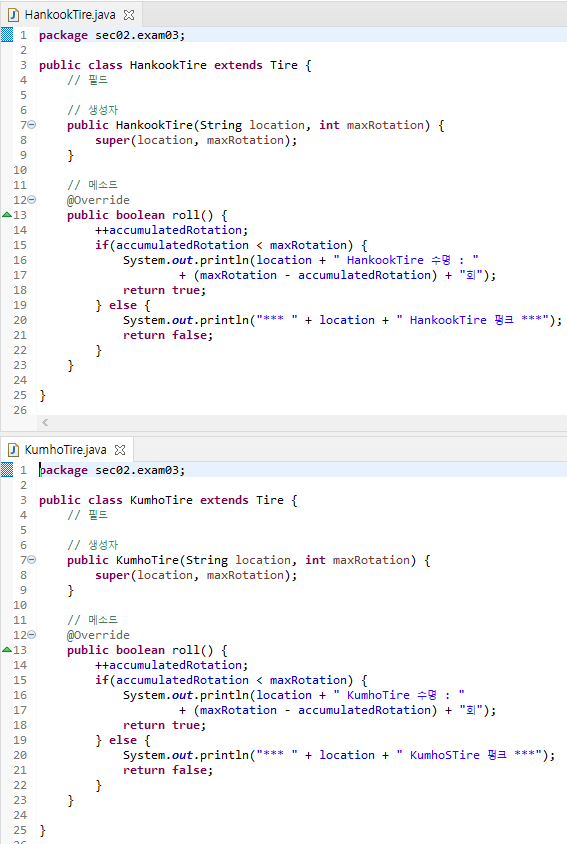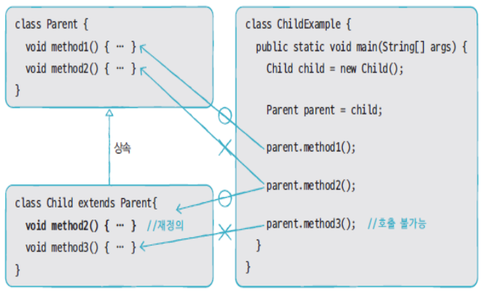 - 예외 : 메소드가 자식 클래스에서 재정의되면, 자식 클래스의 메소드가 대신 호출