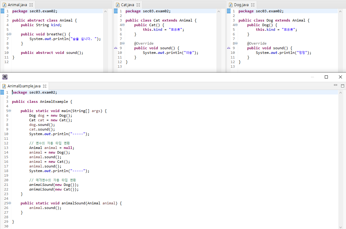 Animal animal = cat; // 부모타입 변수 = 자식타입; (자동 타입 변환)