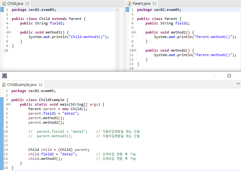 - 부모 타입으로 자동 타입 변환이된 후에는, 부모 클래스에 선언된 필드 및 메소드만 접근이 가능하다.