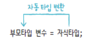 - 바로 위의 부모가 아니더라도 상속 계층에서 상위 타입이라면, 자동 타입 변환이 일어날 수 있다.
